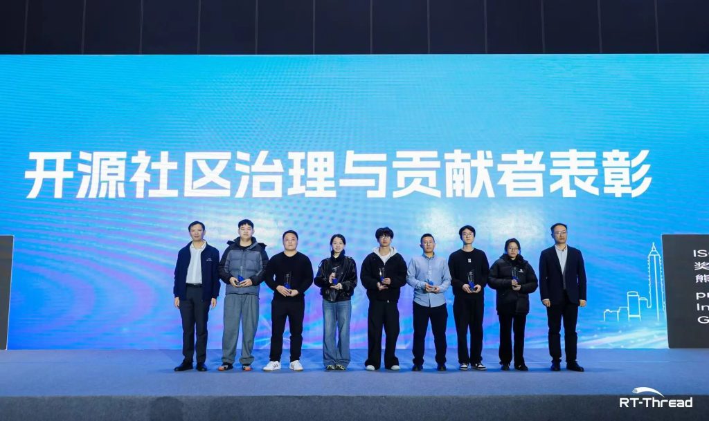 在“开源社区治理与贡献者表彰”环节,RT-Thread为汪辰、樊晓杰、吕家振、黄利亚、吴松杰、陈北斗、吴艺彬7位优秀开发者代表颁发了“生态贡献奖”。该奖项旨在向那些在代码贡献、文档维护、社区运营、技术布道等平凡岗位上做出卓越贡献的开发者们致以最高敬意,这也彰显了开源文化中的协作精神,正是这些无数个体的默默奉献,构筑了社区繁荣与产业进步的坚实根基。