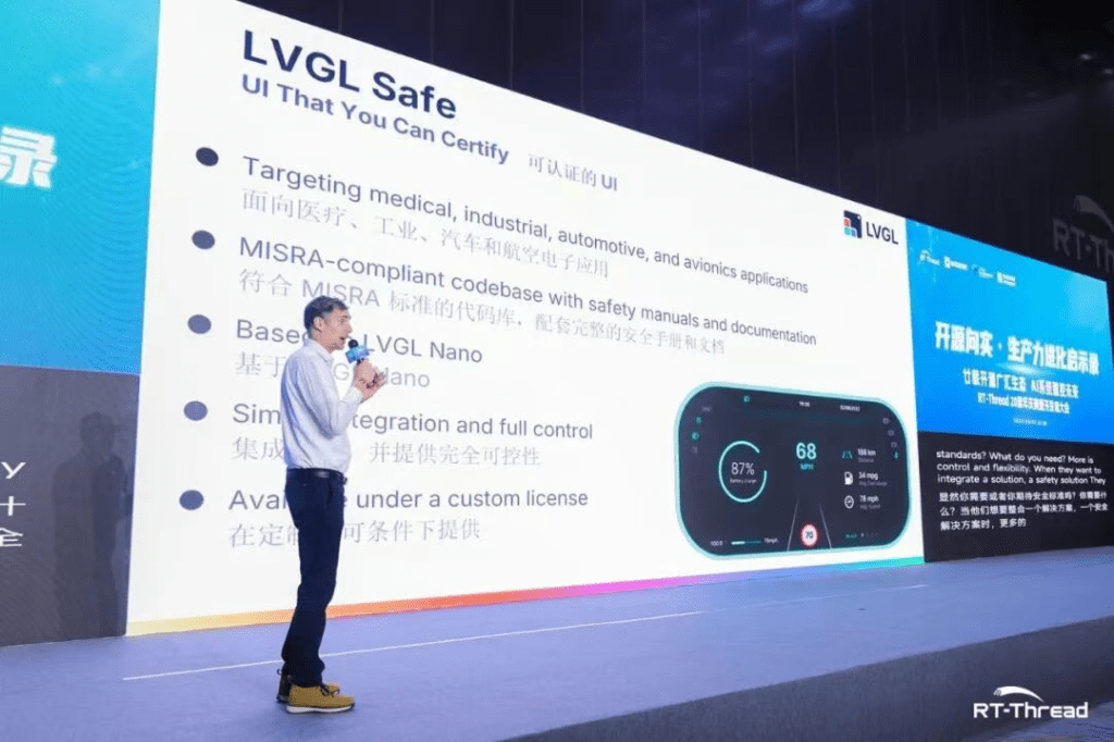 汇聚瑞萨、英飞凌、恩智浦、意法半导体、阿里巴巴达摩院、富瀚微电子、兆易创新、纳芯微电子、芯翰半导体等国内外知名芯片与解决方案厂商,展示最新低功耗边缘AI MCU、端侧AI计算及工业IoT相关技术成果;甲辰计划回顾了和RT-Thread和RISC-V方面的合作融合,并展望下一额十年的发展;LVGL 创始人 Gabor Kiss-Vamosi 首次来华,与中国开发者面对面交流,分享 LVGL未来的规划展望。